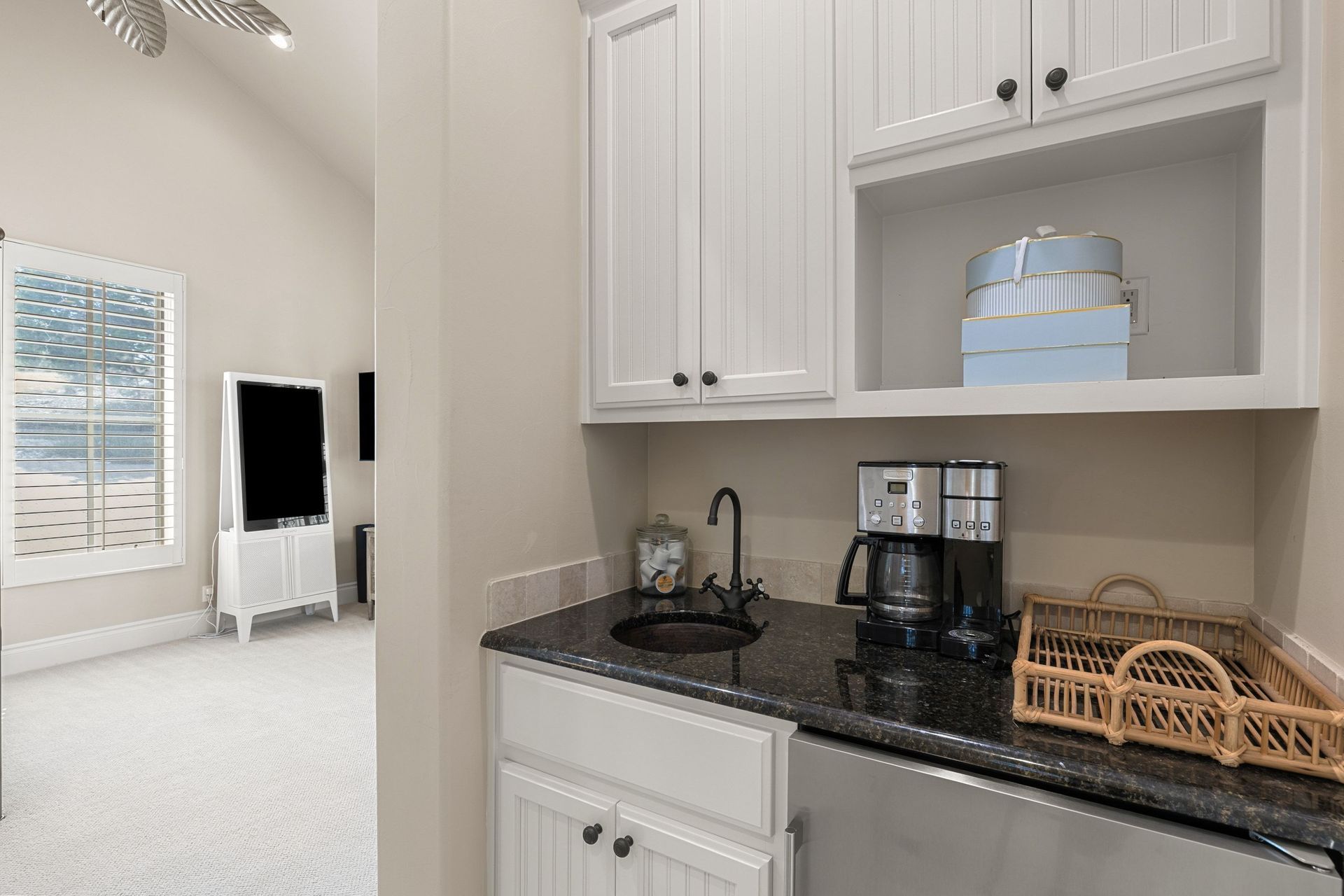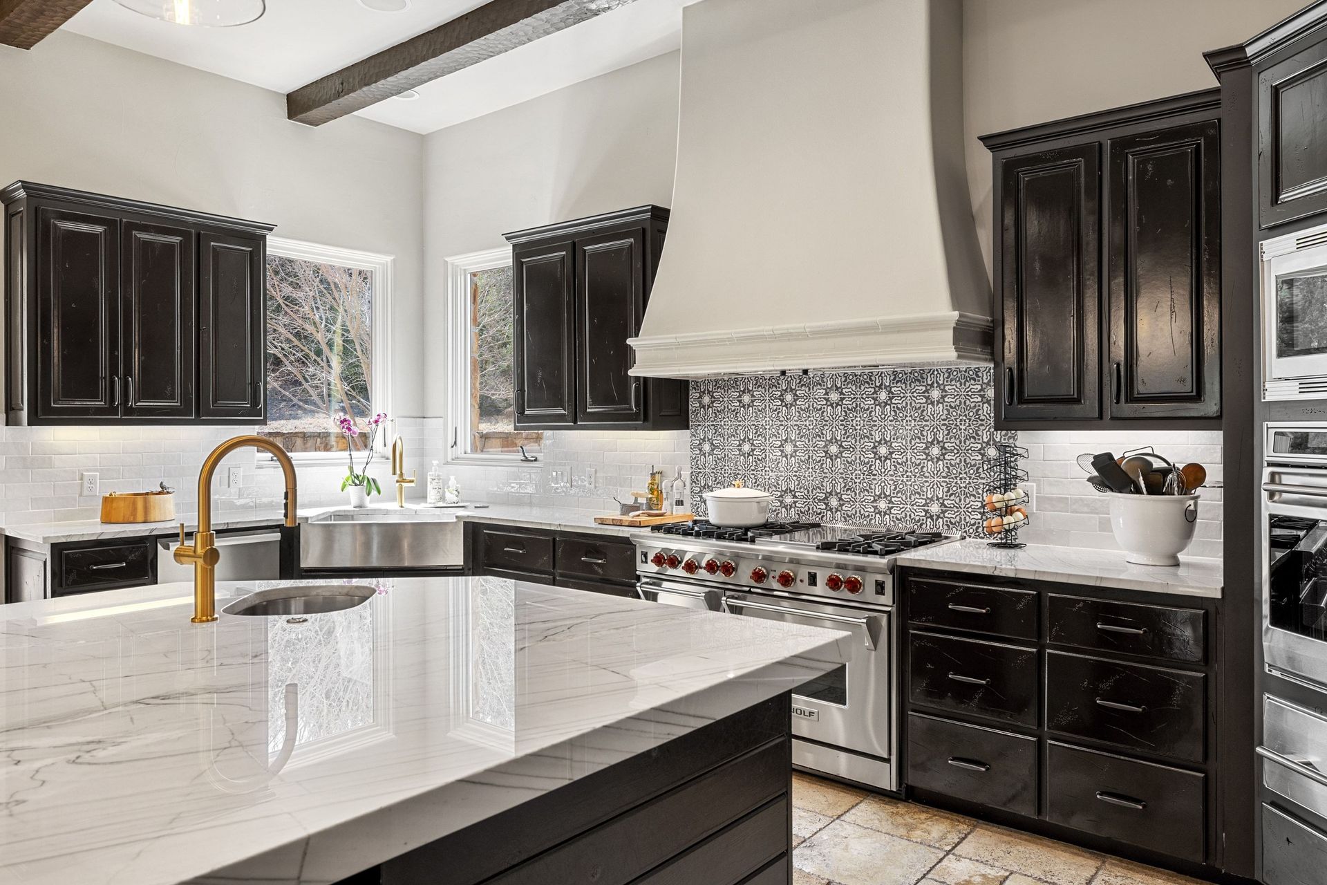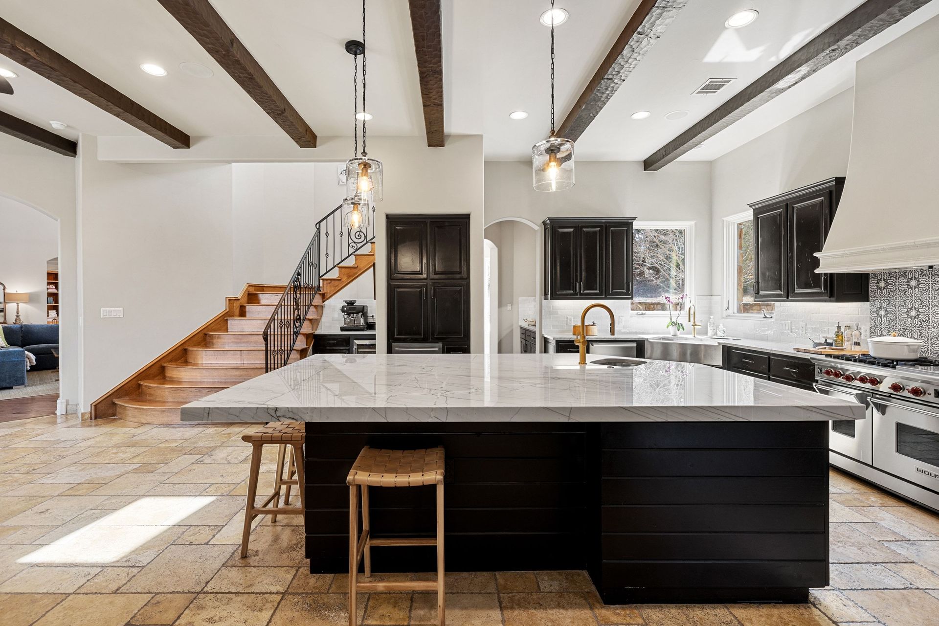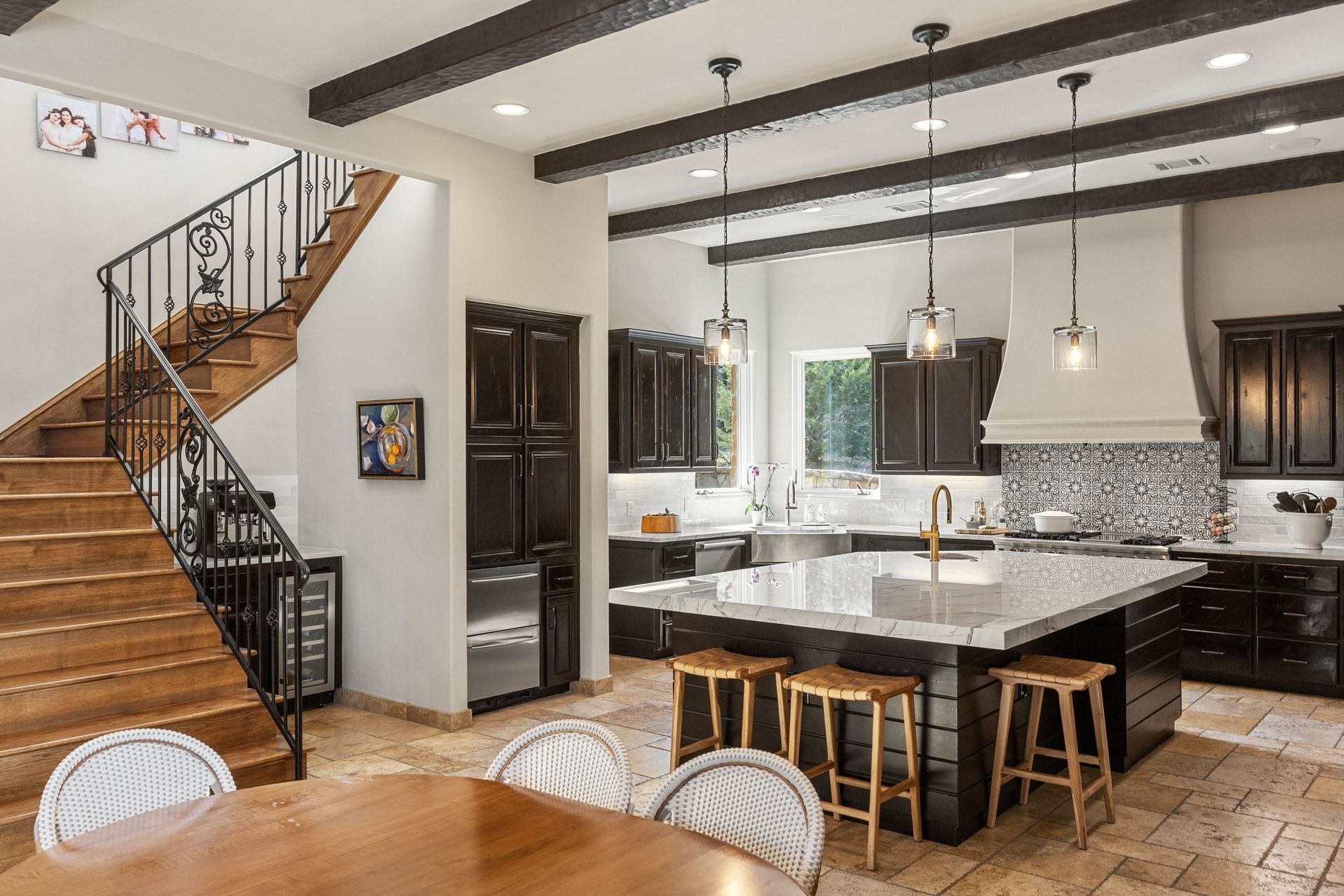 The main residence offers four bedrooms, including a primary suite on the main level, complemented by multiple gathering spaces that transition seamlessly from one to the next. The kitchen anchors the social core of the home, connecting living and dining areas while maintaining visual continuity to the outdoor setting.