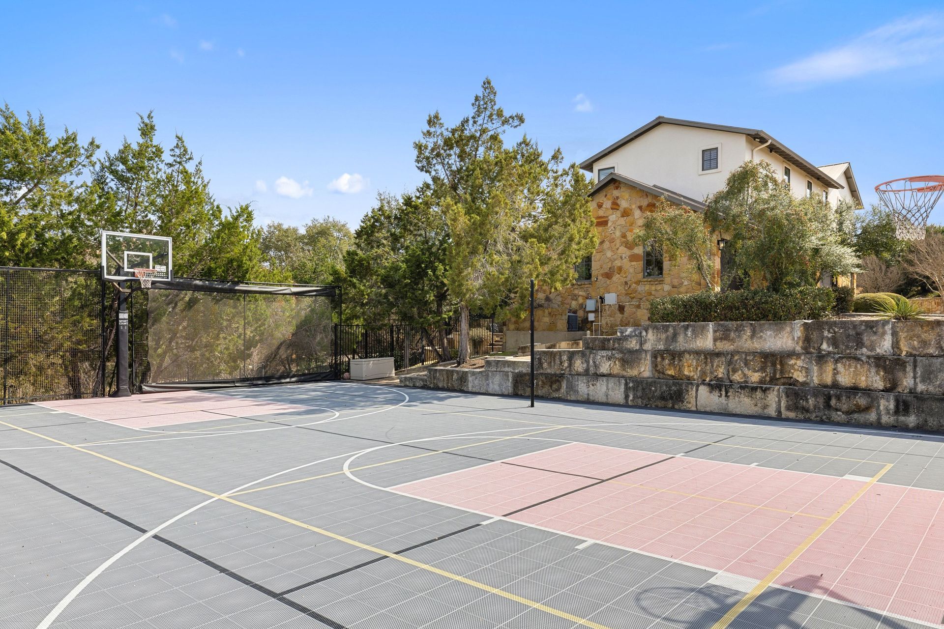 Outdoor living is thoughtfully curated to expand the experience beyond the interiors. A resort-inspired pool and spa are framed by generous patio areas and lush surroundings, creating multiple zones for gathering, relaxation, and recreation. A dedicated sport court further enriches the lifestyle offering, introducing a recreational amenity that complements the estate’s expansive footprint.