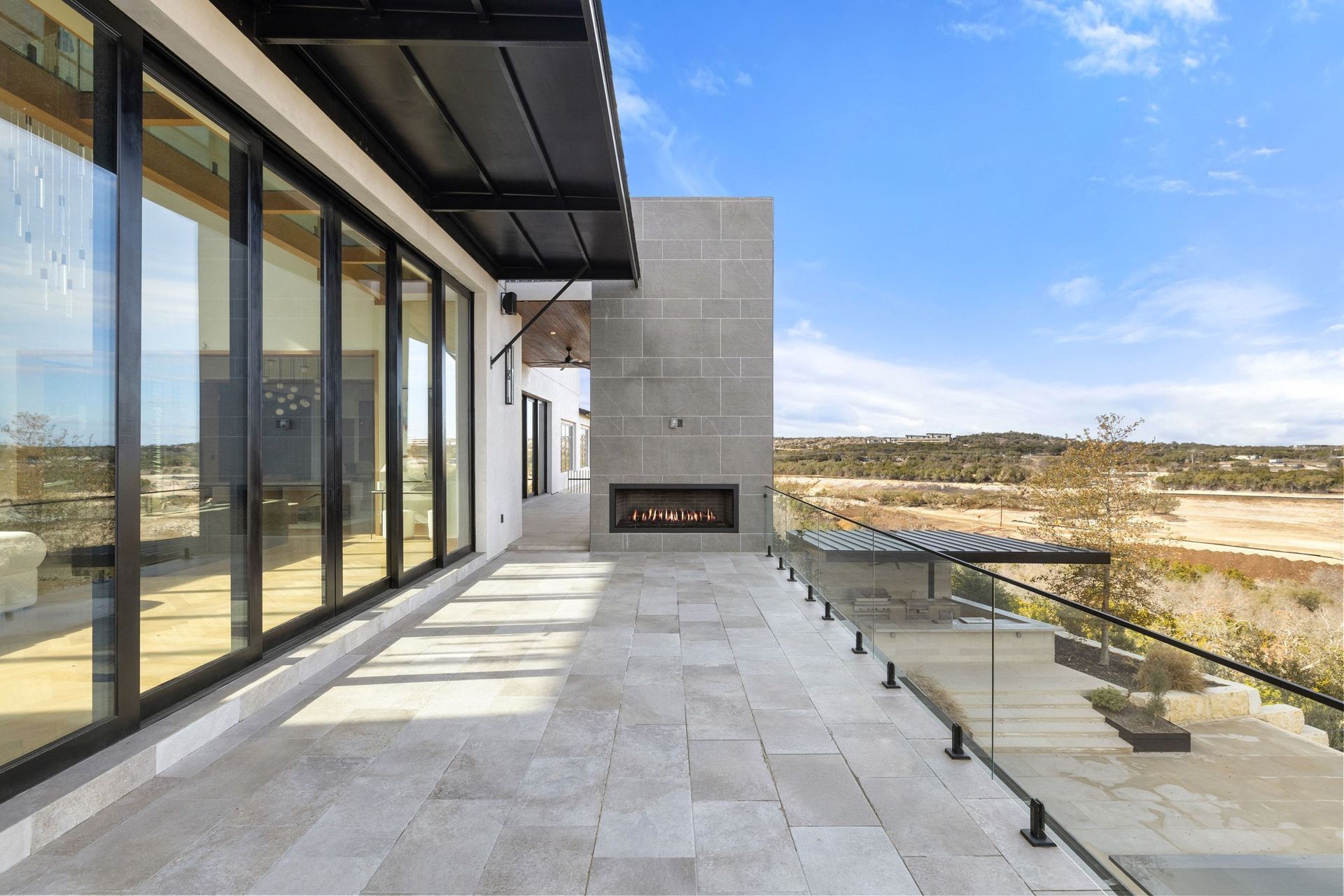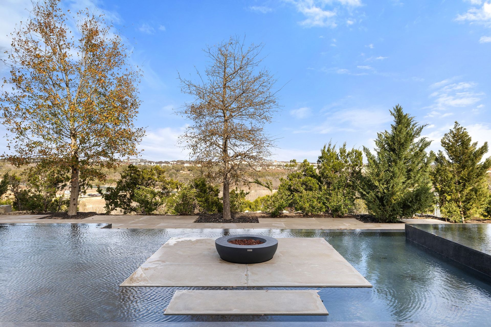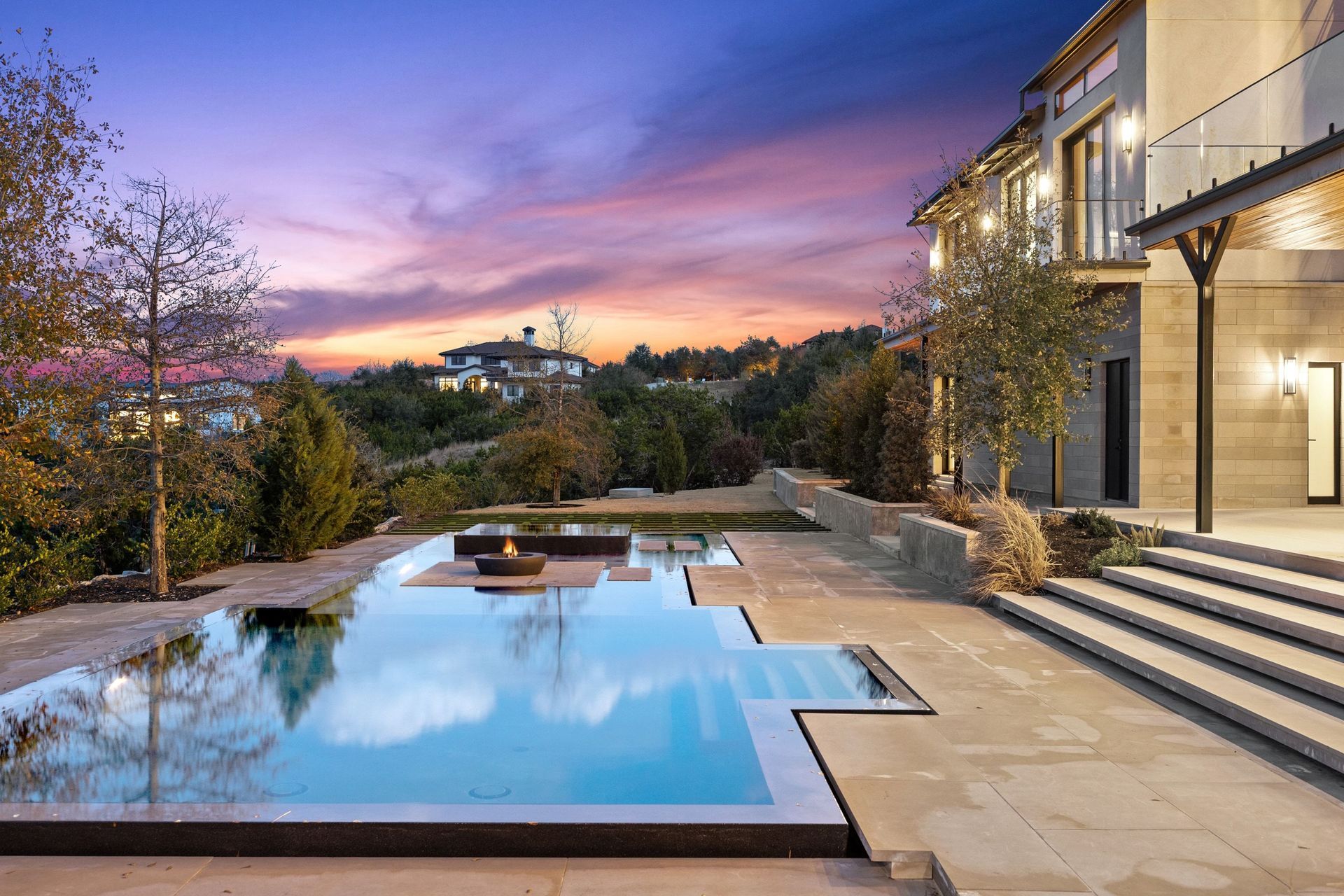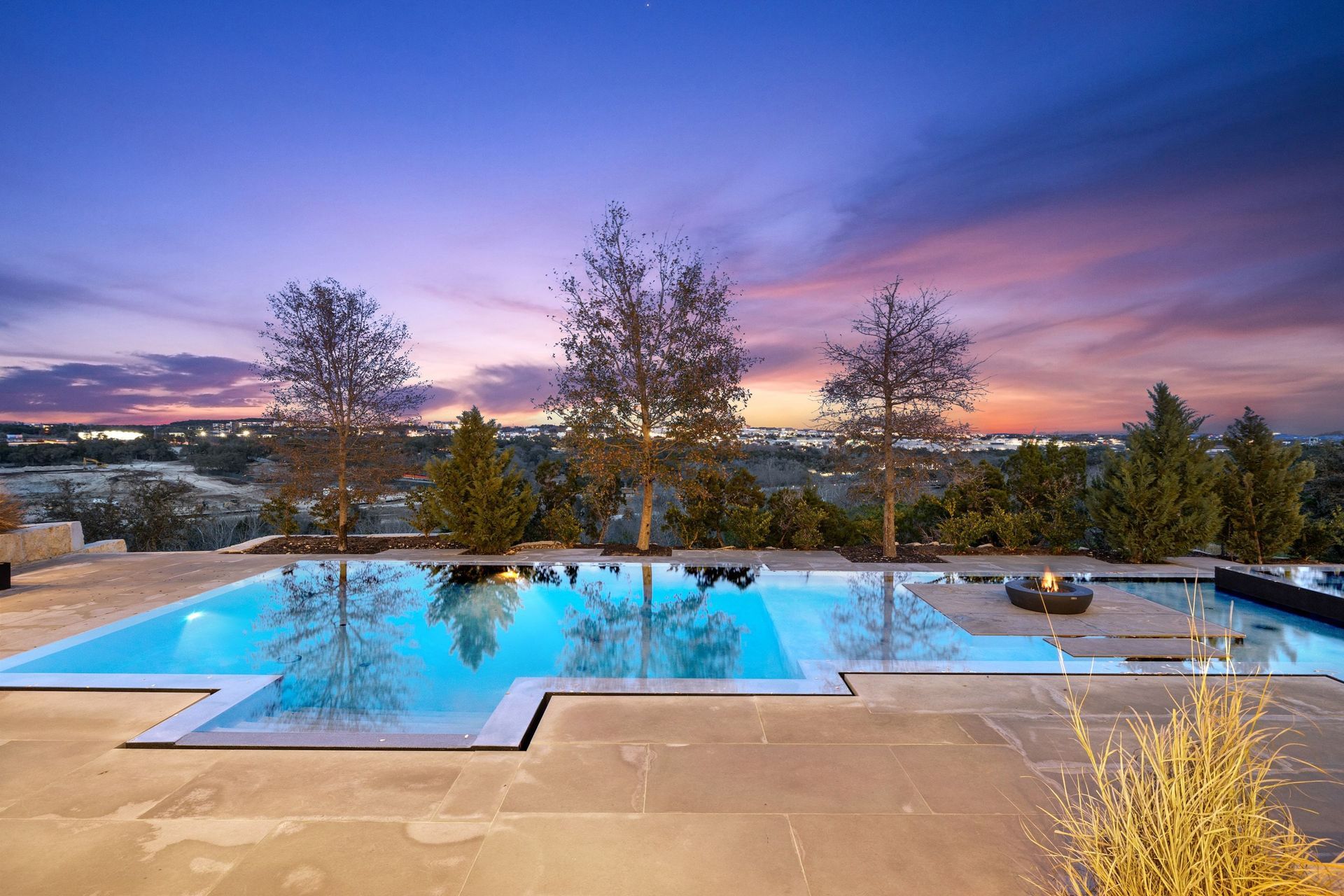 Outdoors, terraced patios overlook the surrounding Hill Country. A resort-style pool features a fire element integrated within the water, creating a dramatic focal point after sunset. Nearby, a separate fire pit provides another place to gather, while a pickleball court introduces a rare recreational amenity that reinforces the home’s emphasis on vitality and lifestyle.