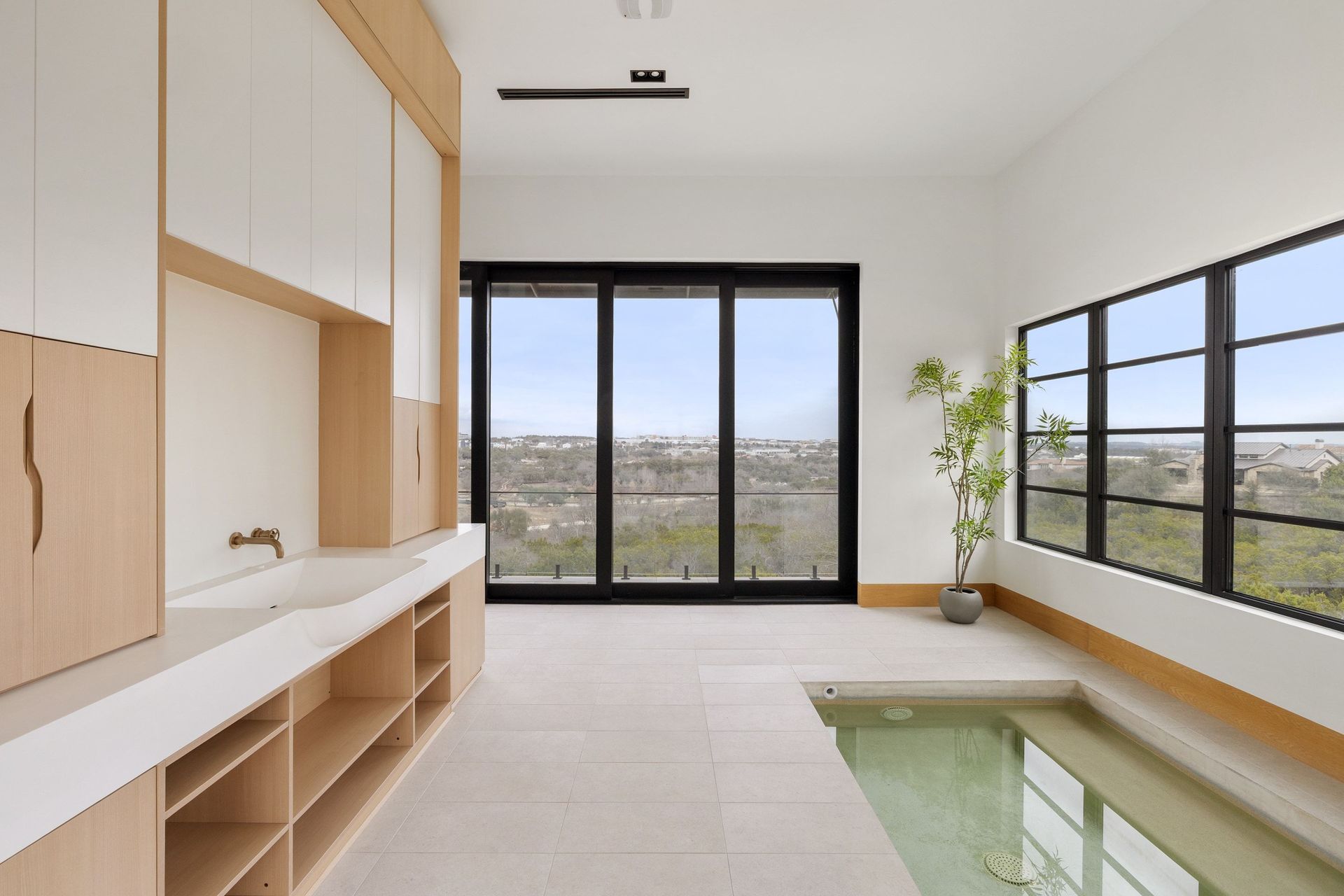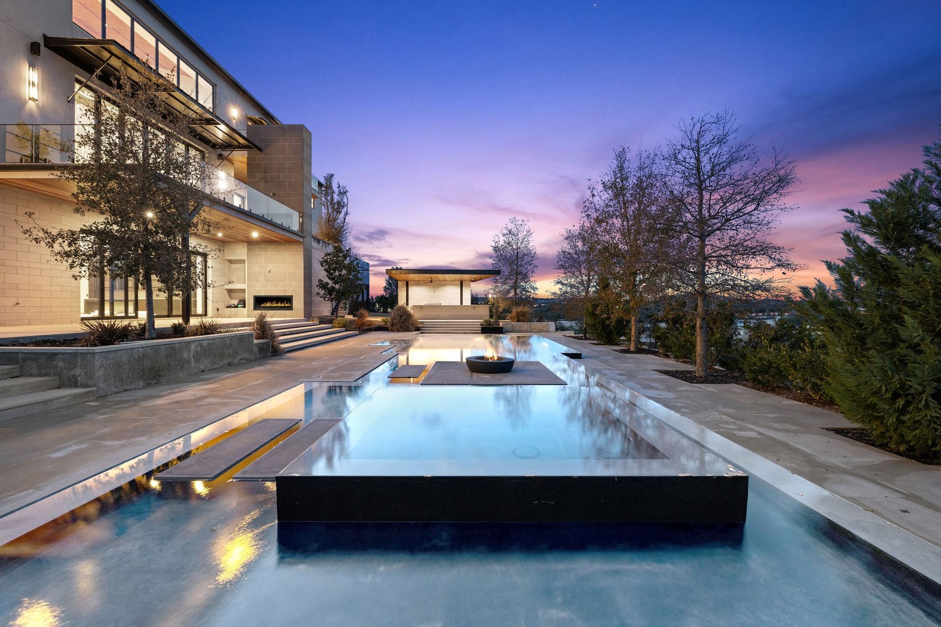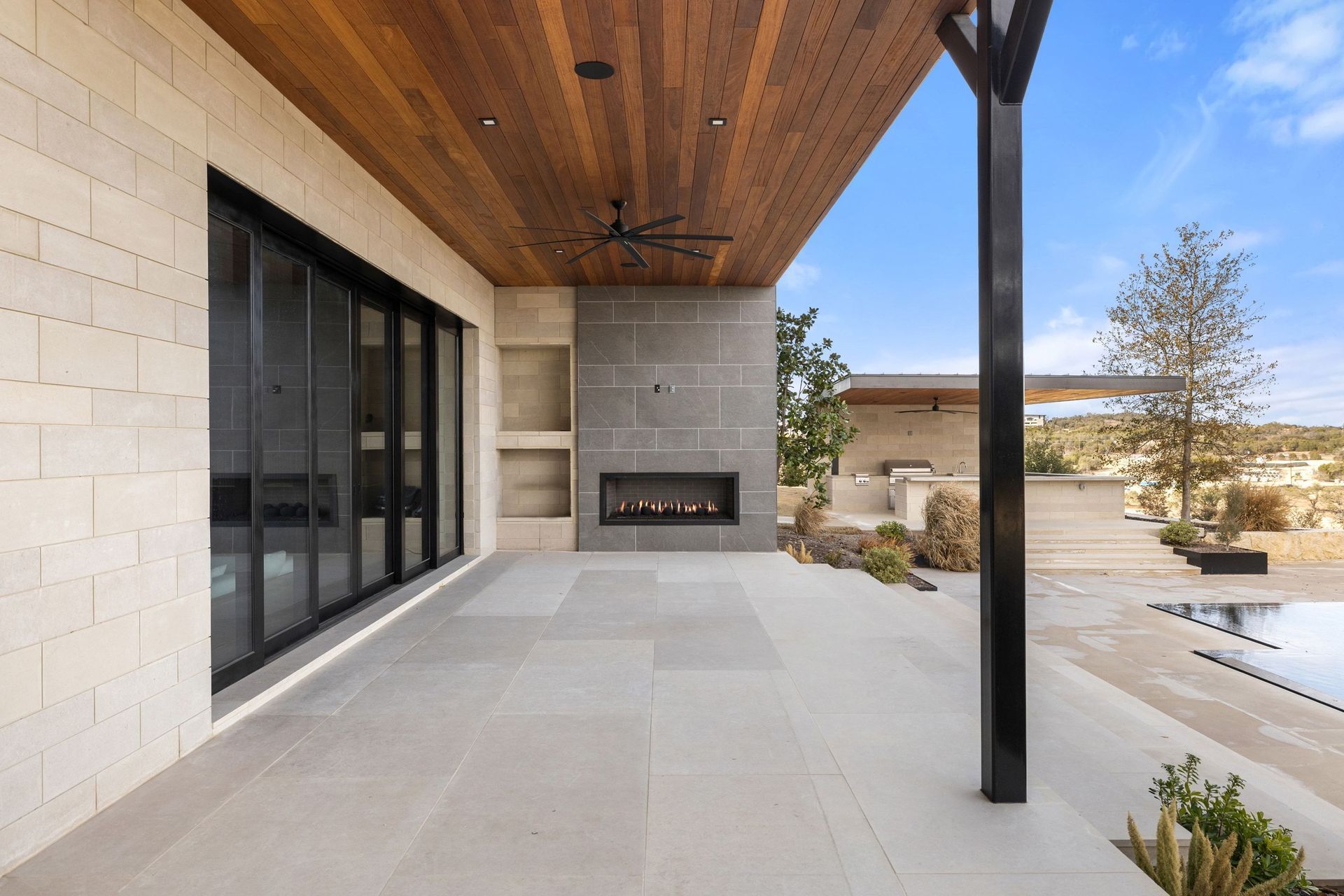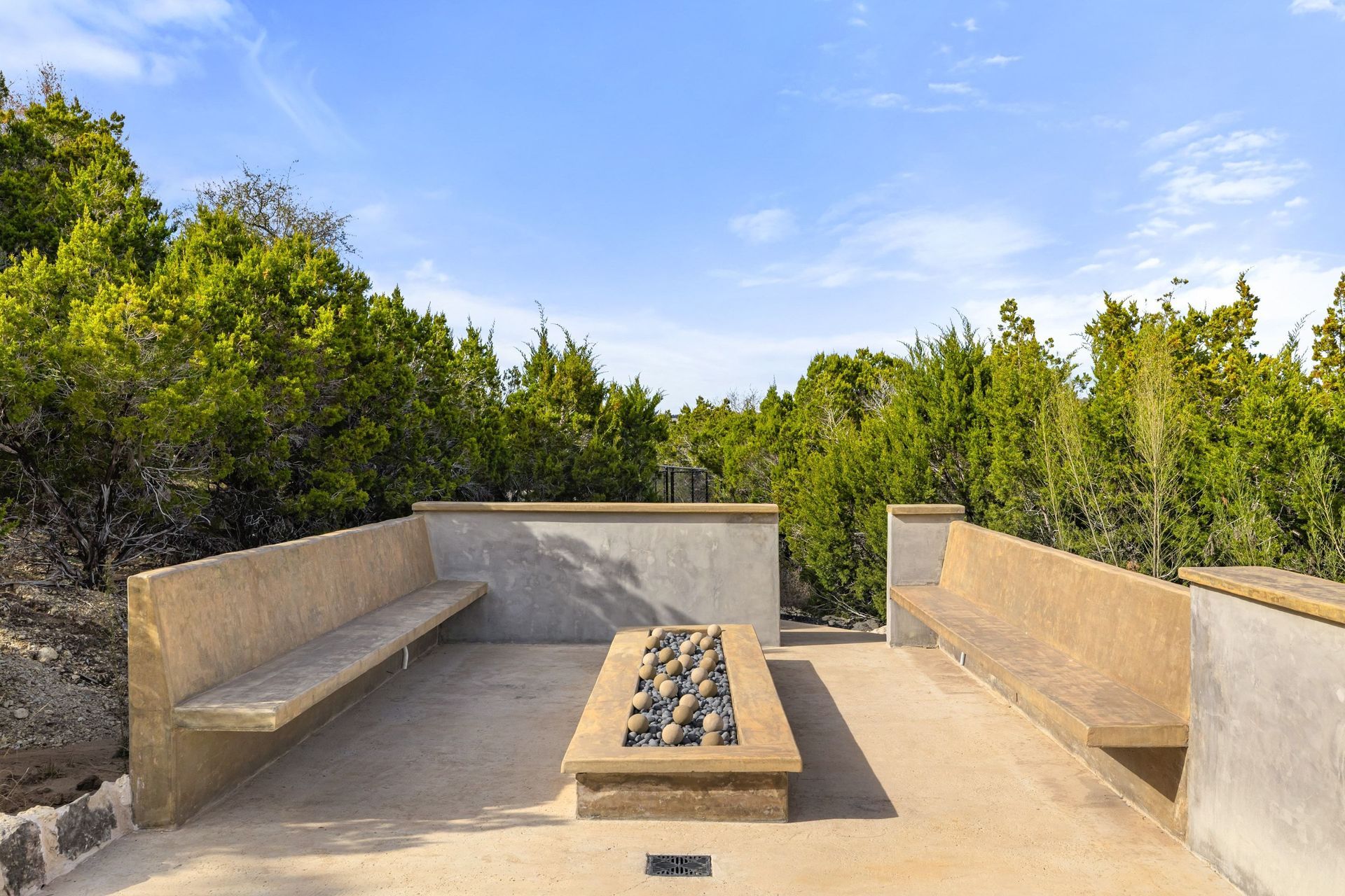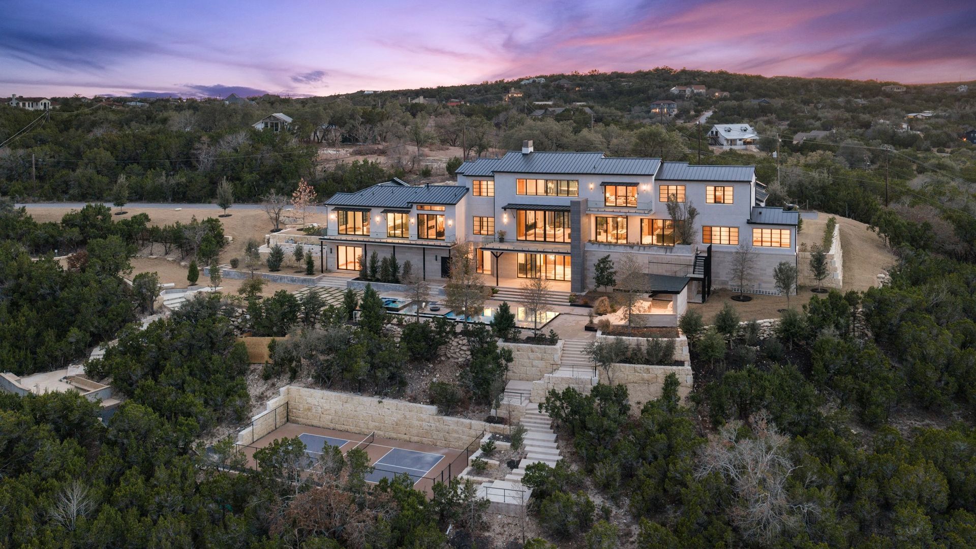 Outdoors, terraced patios overlook the surrounding Hill Country. A resort-style pool features a fire element integrated within the water, creating a dramatic focal point after sunset. Nearby, a separate fire pit provides another place to gather, while a pickleball court introduces a rare recreational amenity that reinforces the home’s emphasis on vitality and lifestyle.