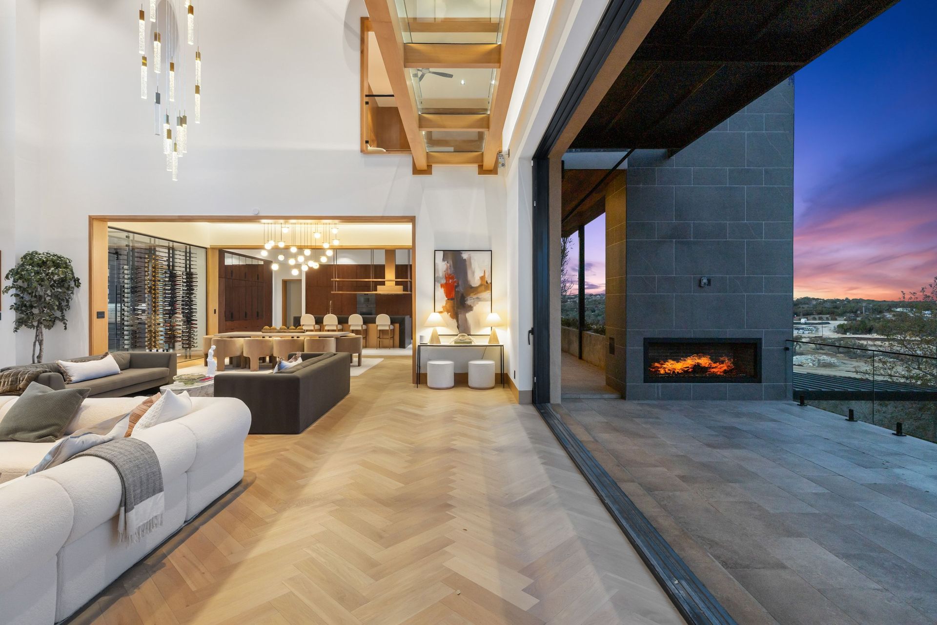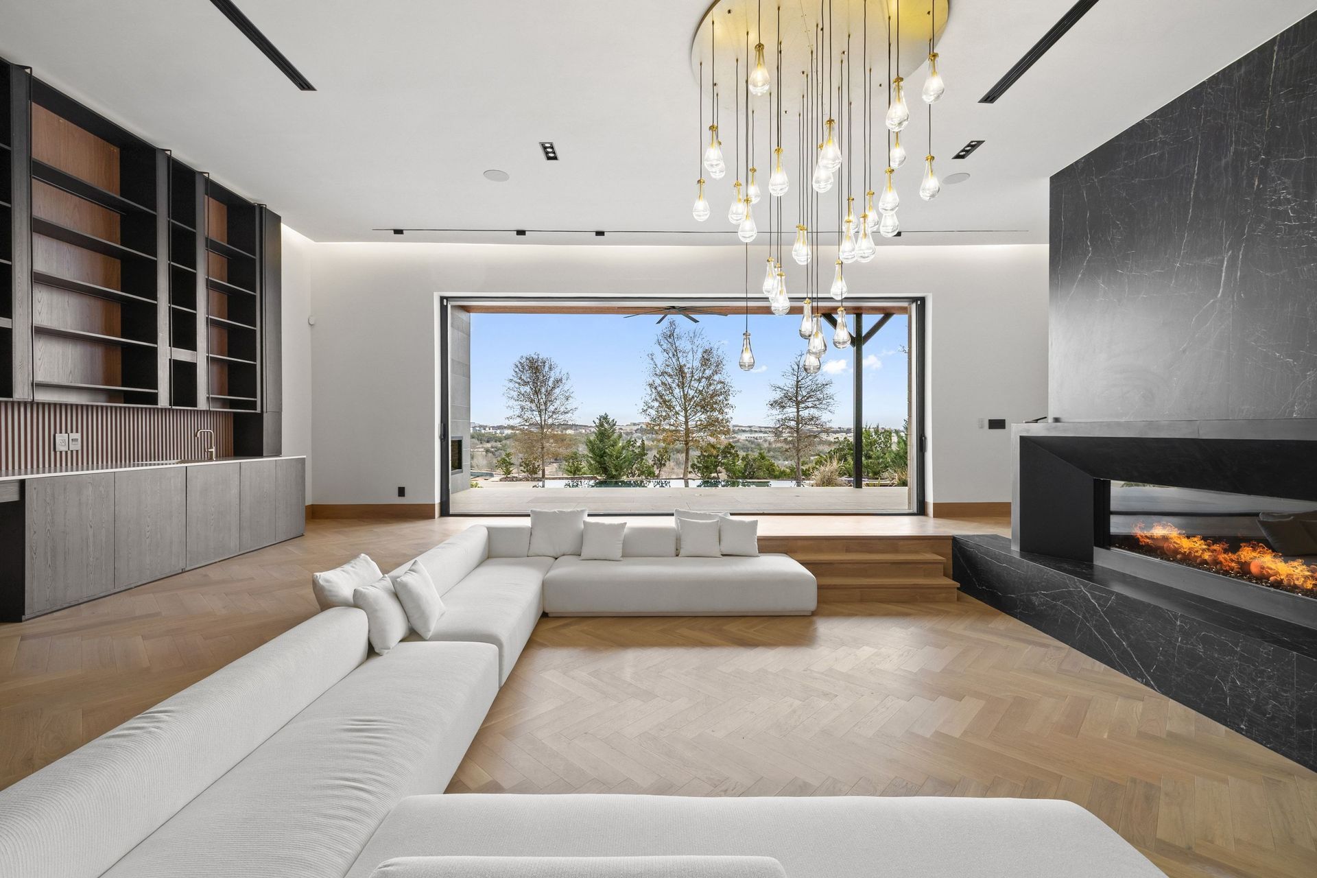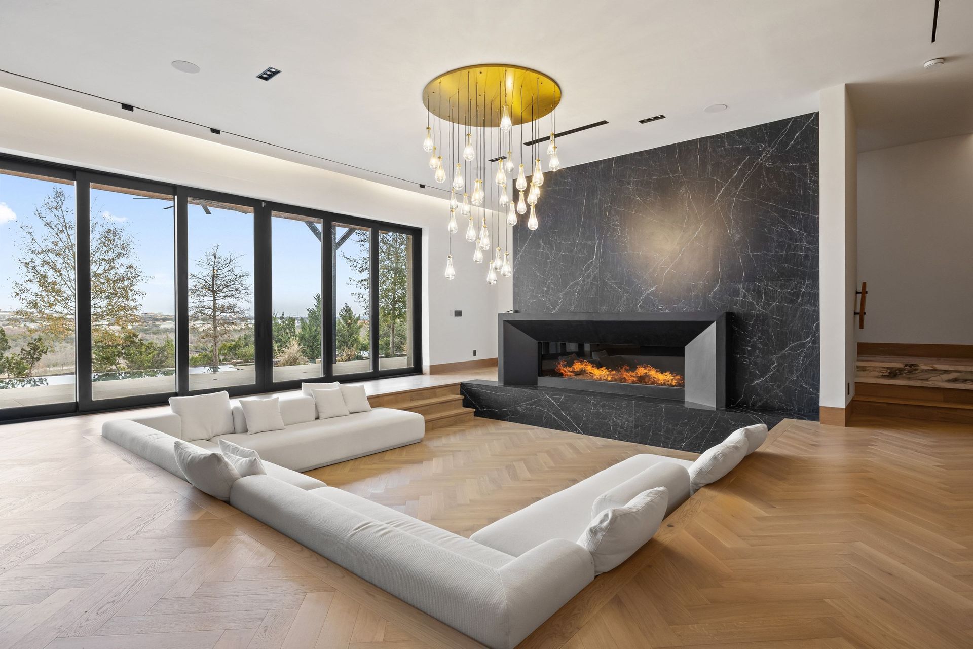 An intimate lounge offers a secondary setting within the residence. Centered around a fireplace and custom built-ins, it opens to the outdoors through a full wall of retractable glass, blending interior and exterior spaces. Tiered seating and sculptural lighting create an atmosphere suited for conversation and relaxed evenings.