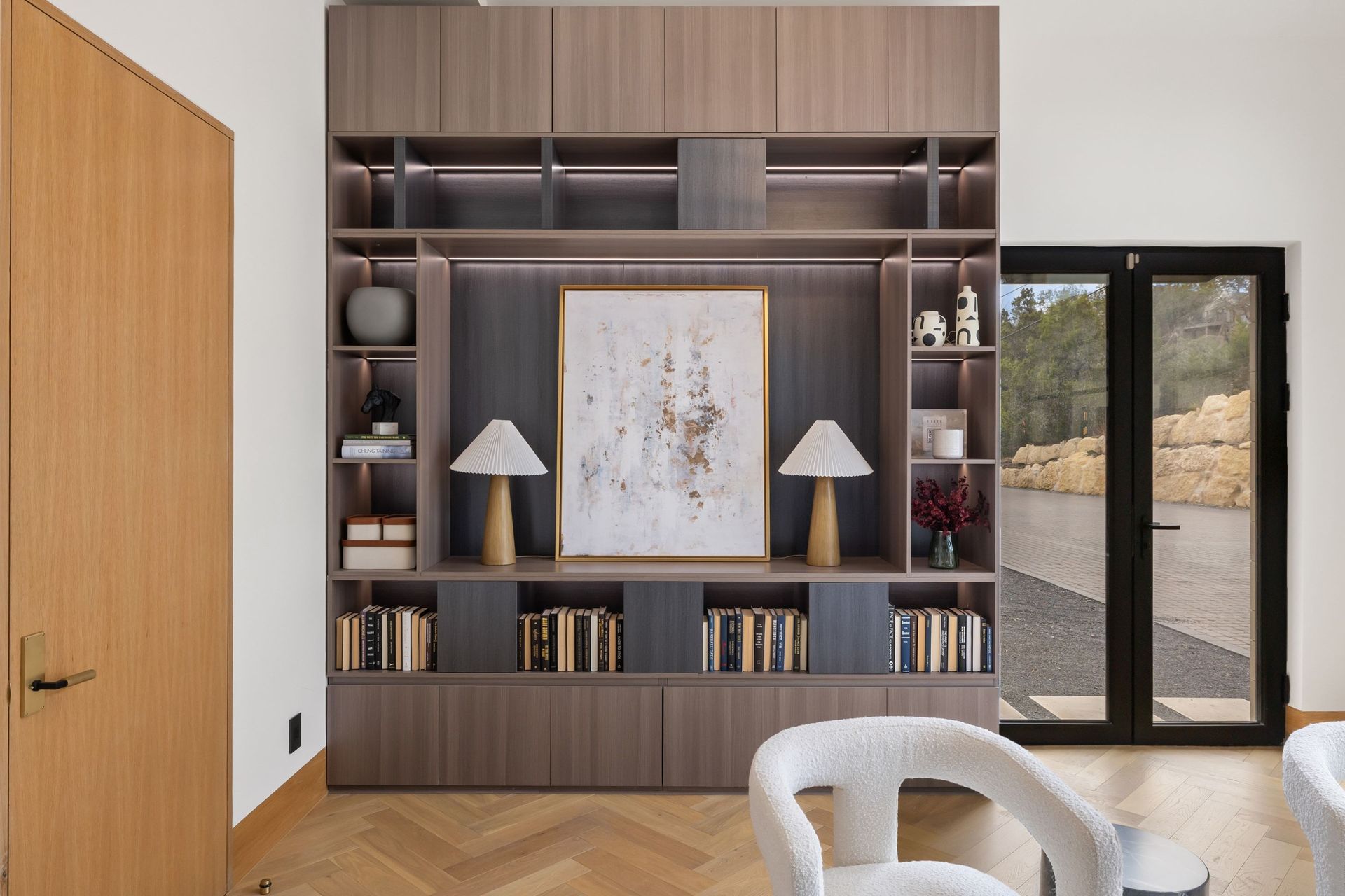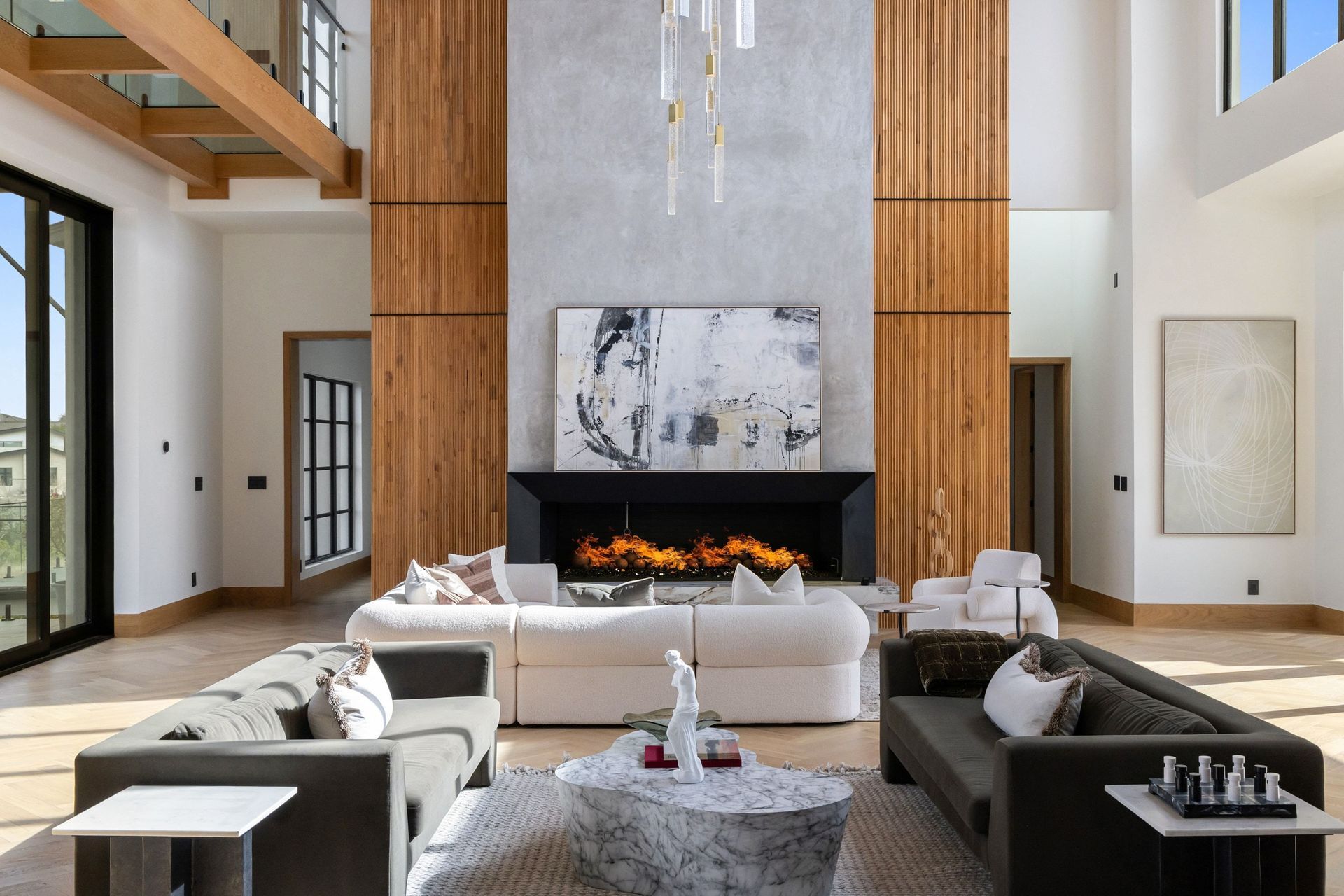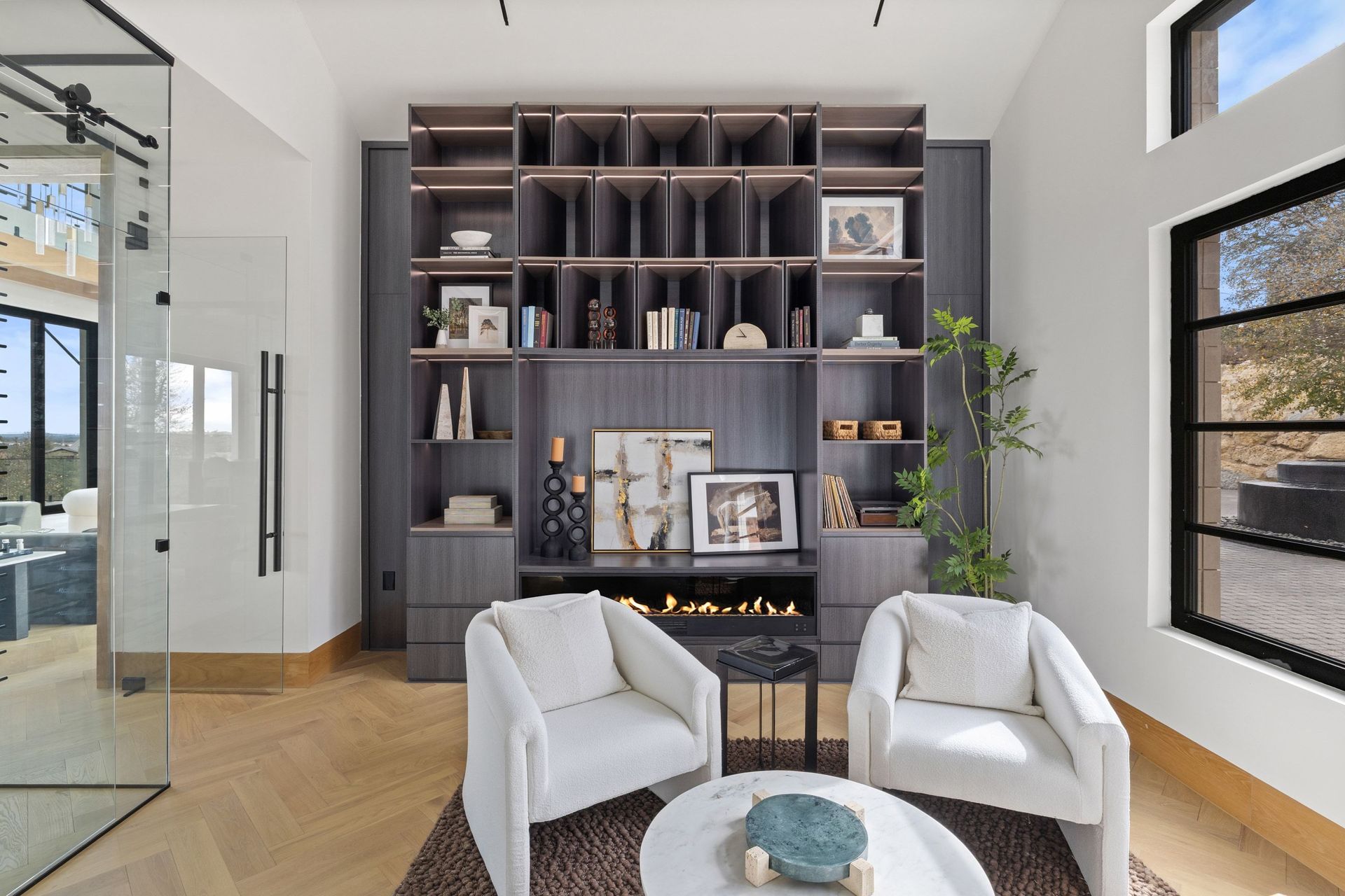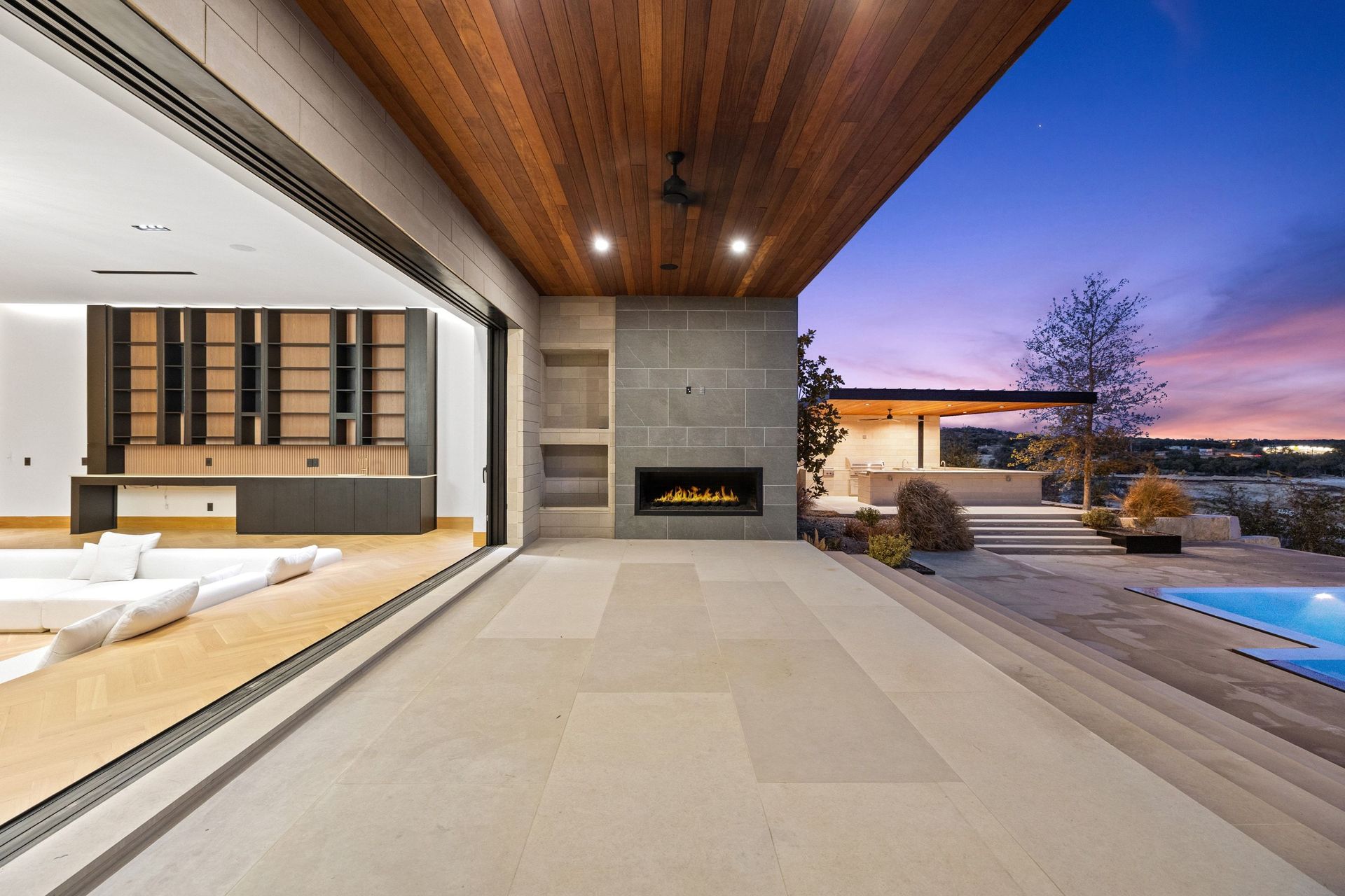 An intimate lounge offers a secondary setting within the residence. Centered around a fireplace and custom built-ins, it opens to the outdoors through a full wall of retractable glass, blending interior and exterior spaces. Tiered seating and sculptural lighting create an atmosphere suited for conversation and relaxed evenings.
