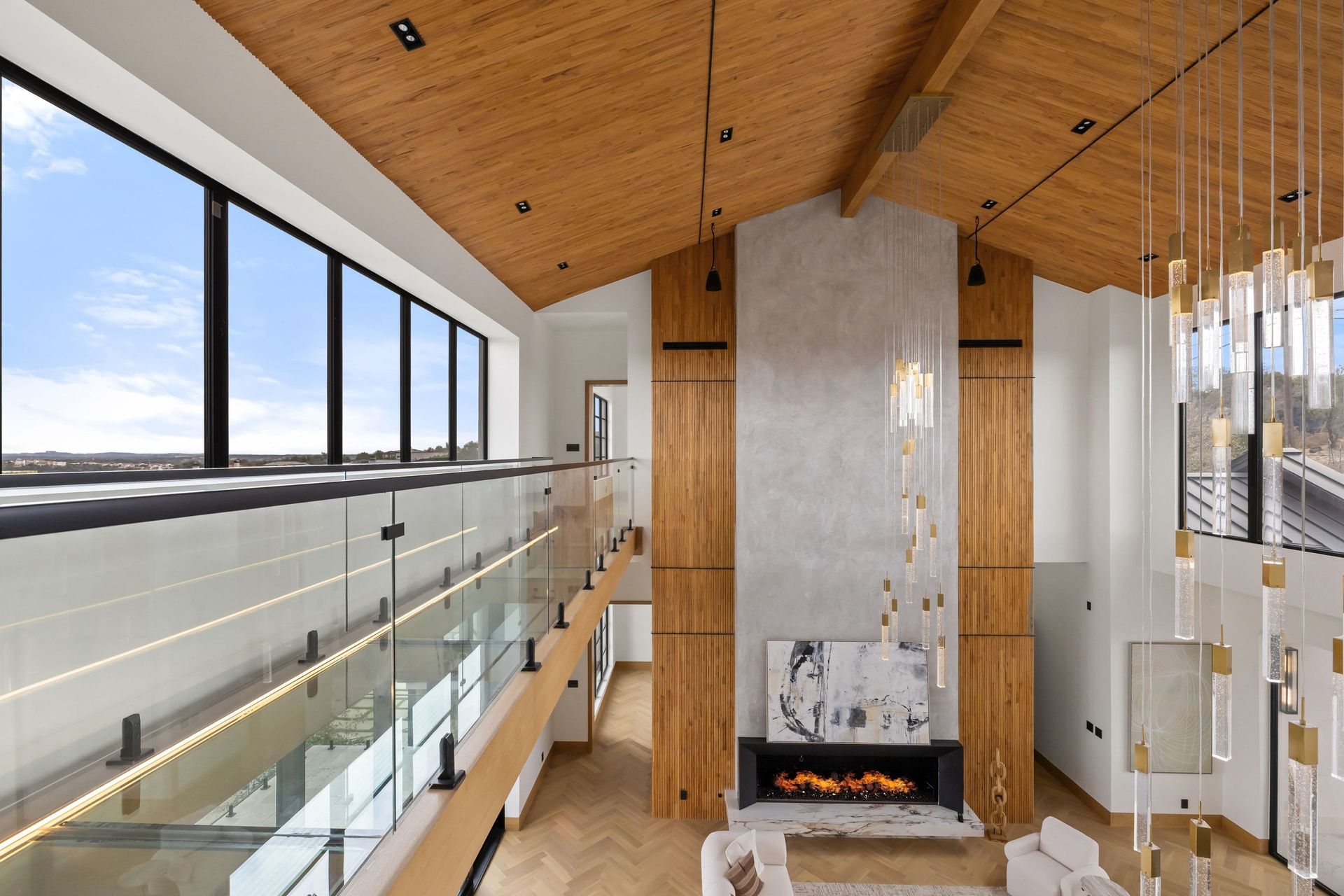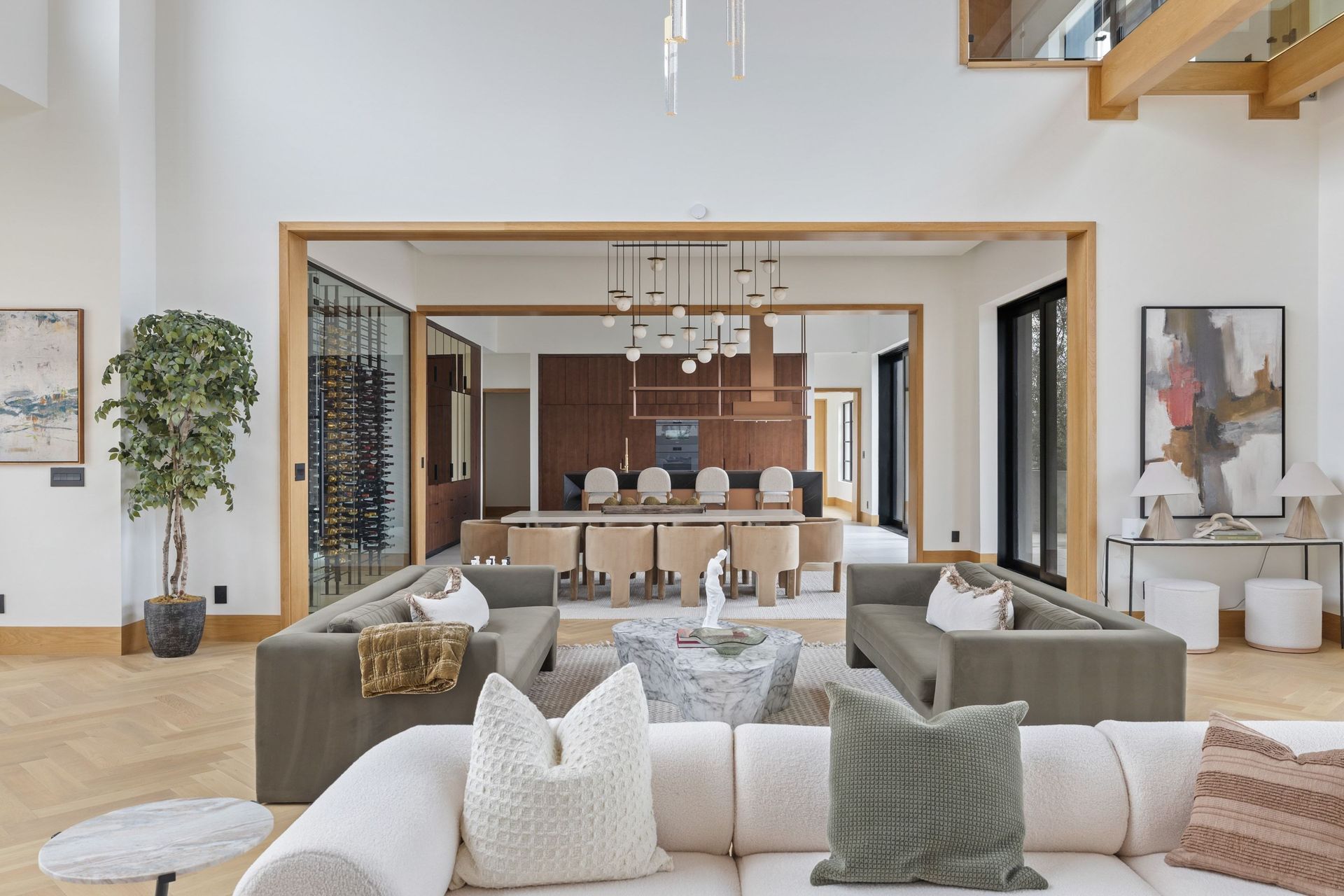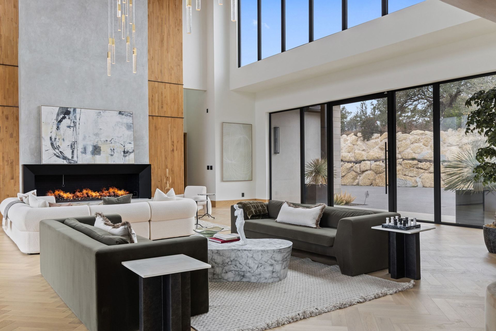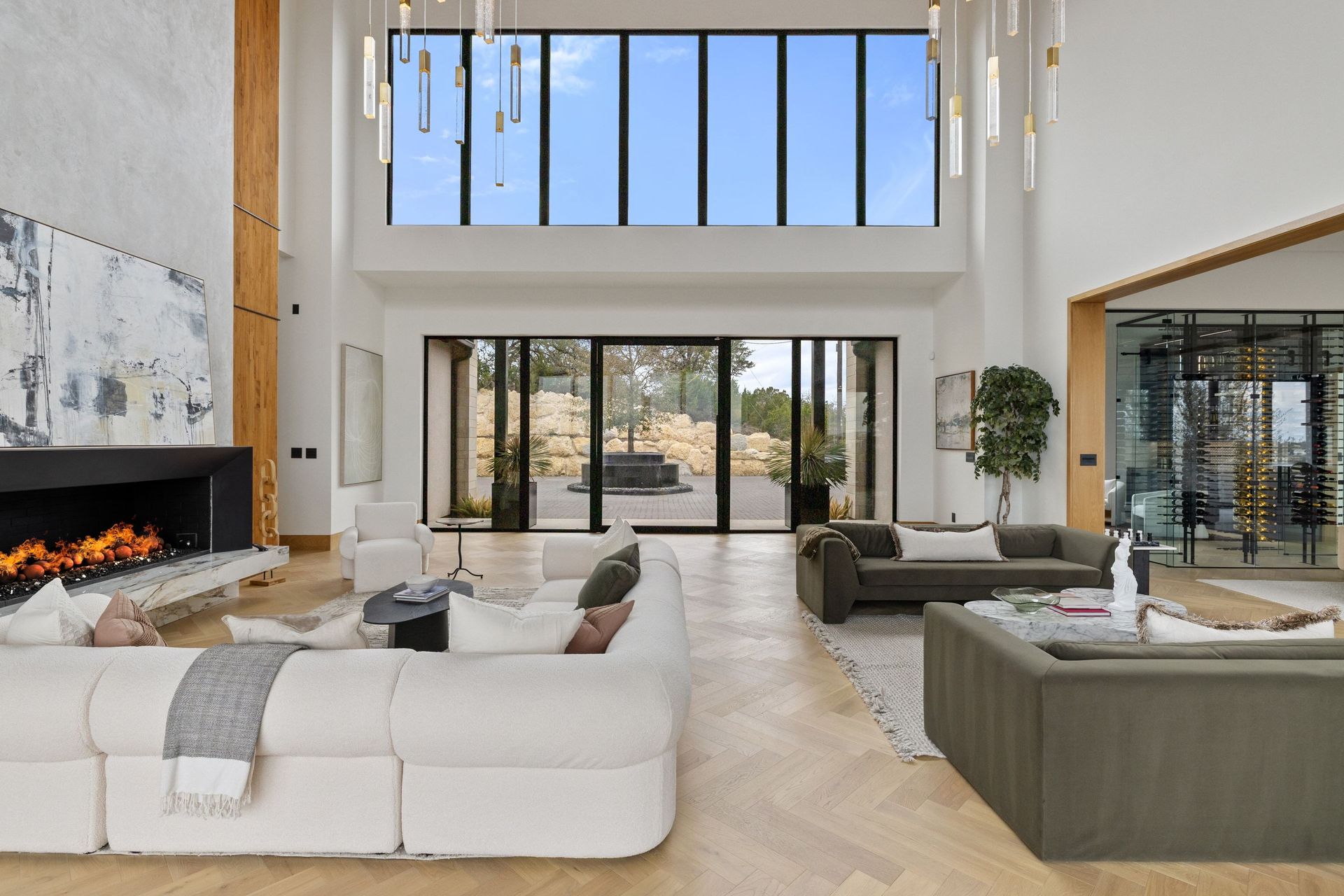 Upon entry, grand yet welcoming interiors unfold, framed by walls of glass that capture sweeping views and natural light throughout the day. Living areas connect organically, equally comfortable for everyday life or formal hosting. Fireplaces, curated finishes, and balanced proportions lend warmth without sacrificing refinement.