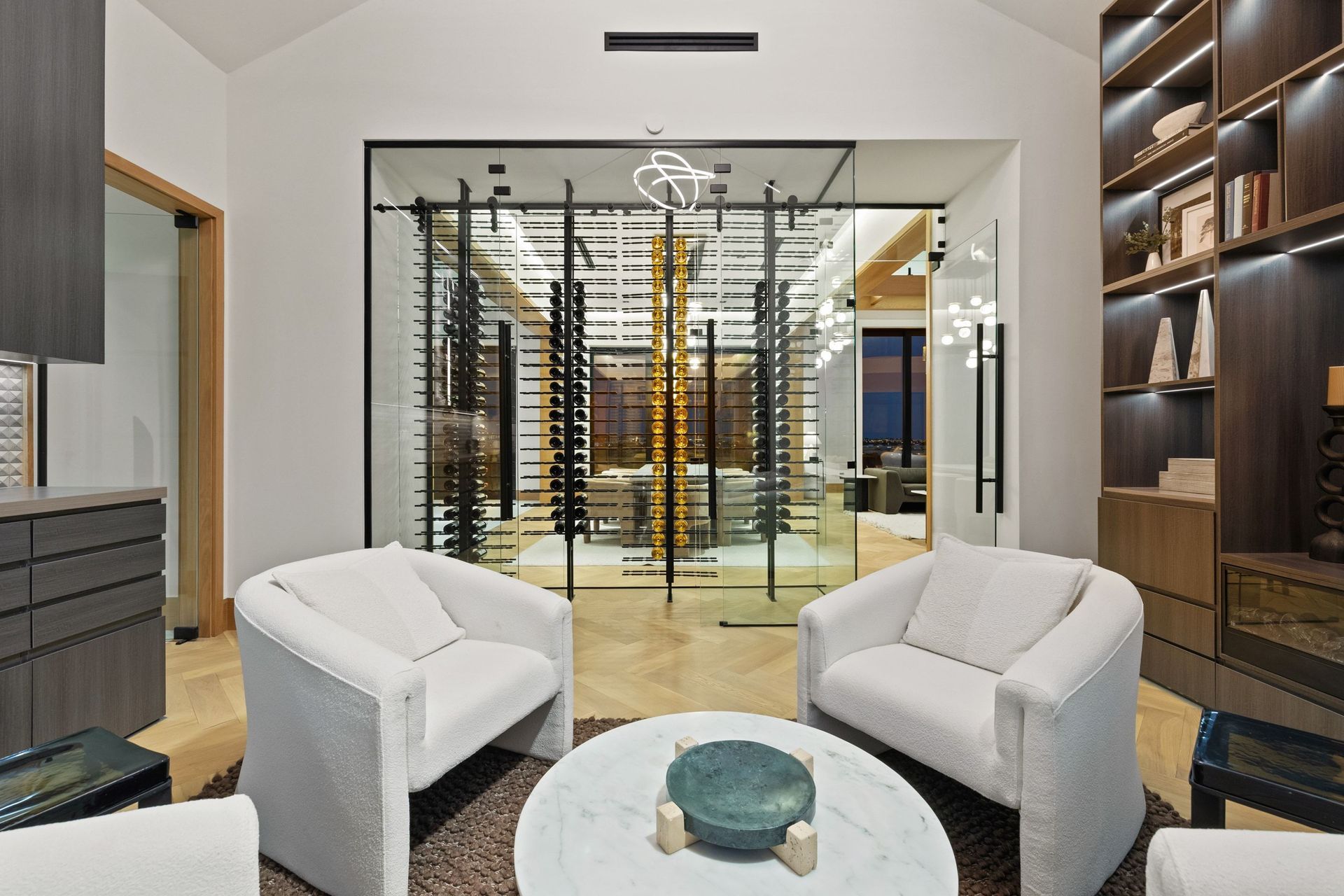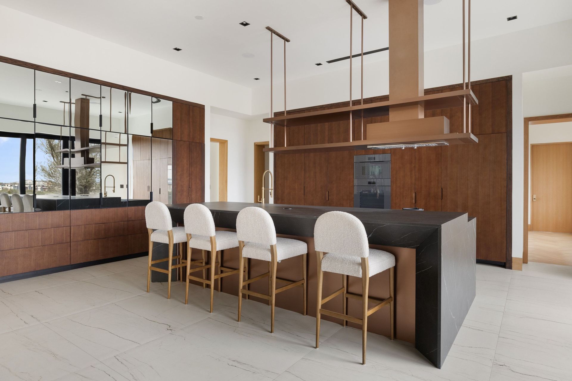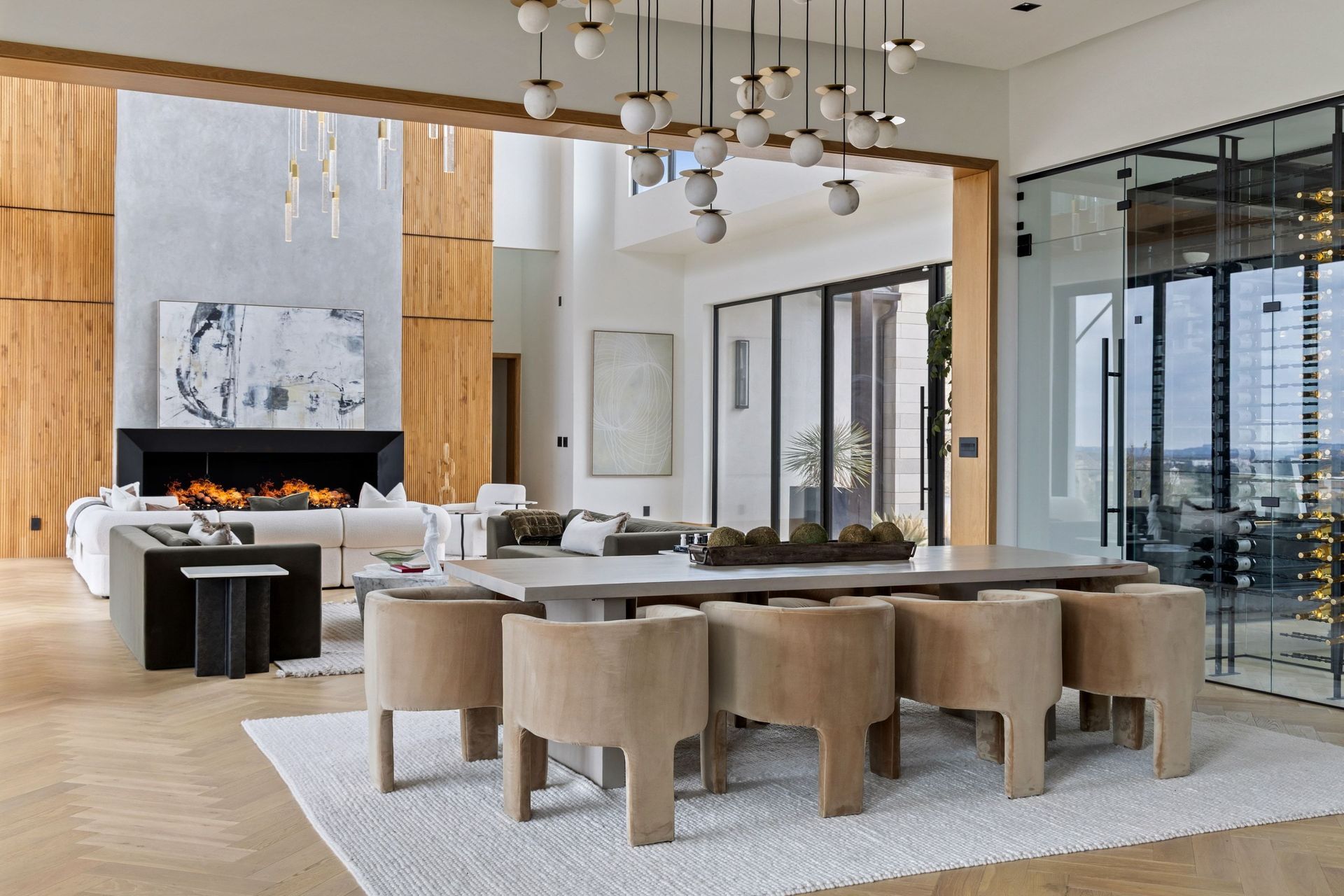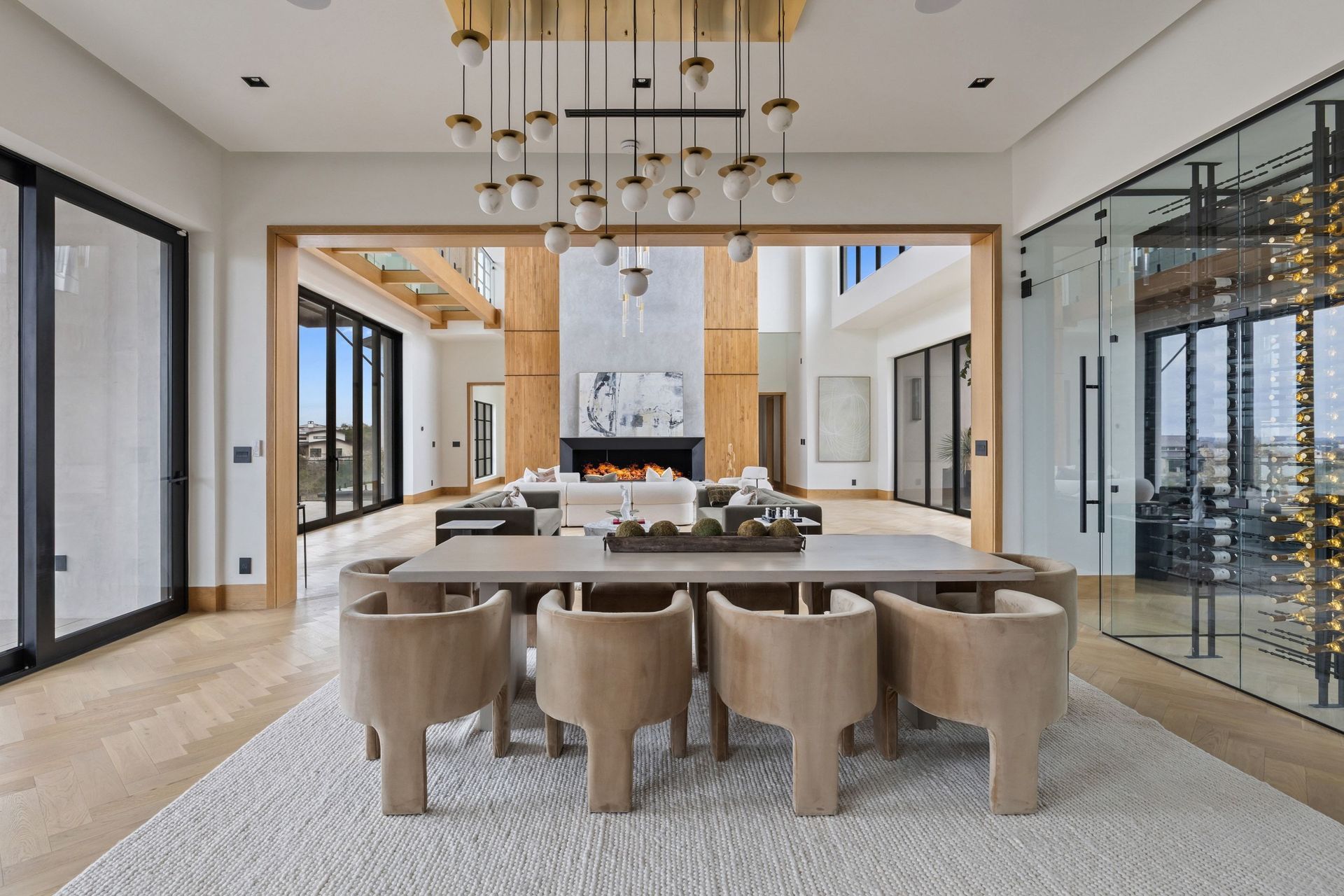 The kitchen and dining areas anchor the home’s central interiors. Custom cabinetry, generous stone surfaces, and professional-grade appliances define the chef’s kitchen, complemented by a fully outfitted butler’s kitchen for discreet hosting. A striking wine tower grounds the dining room, while a built-in bar creates a focal point for entertaining.