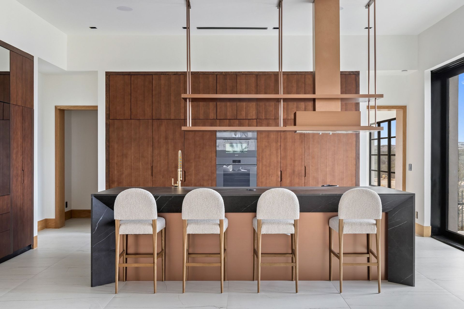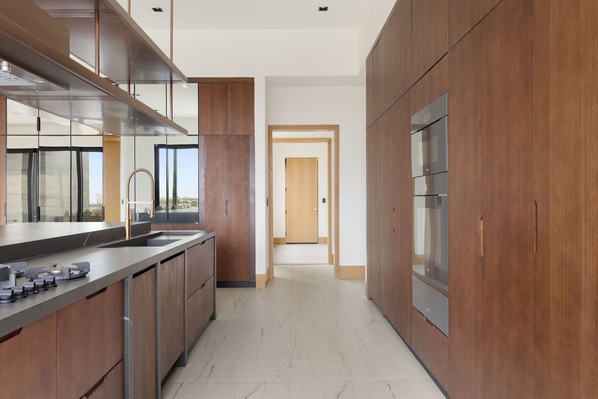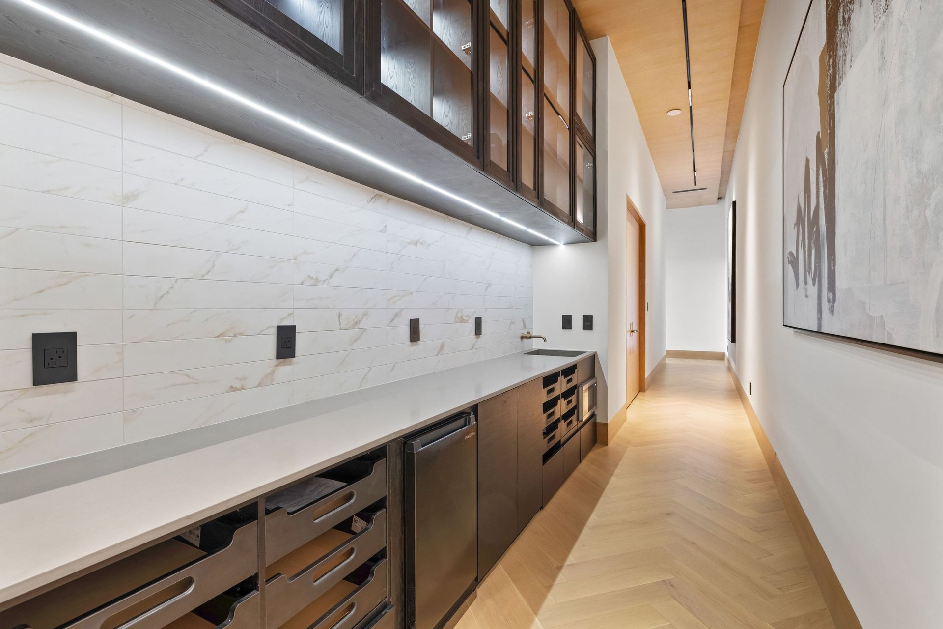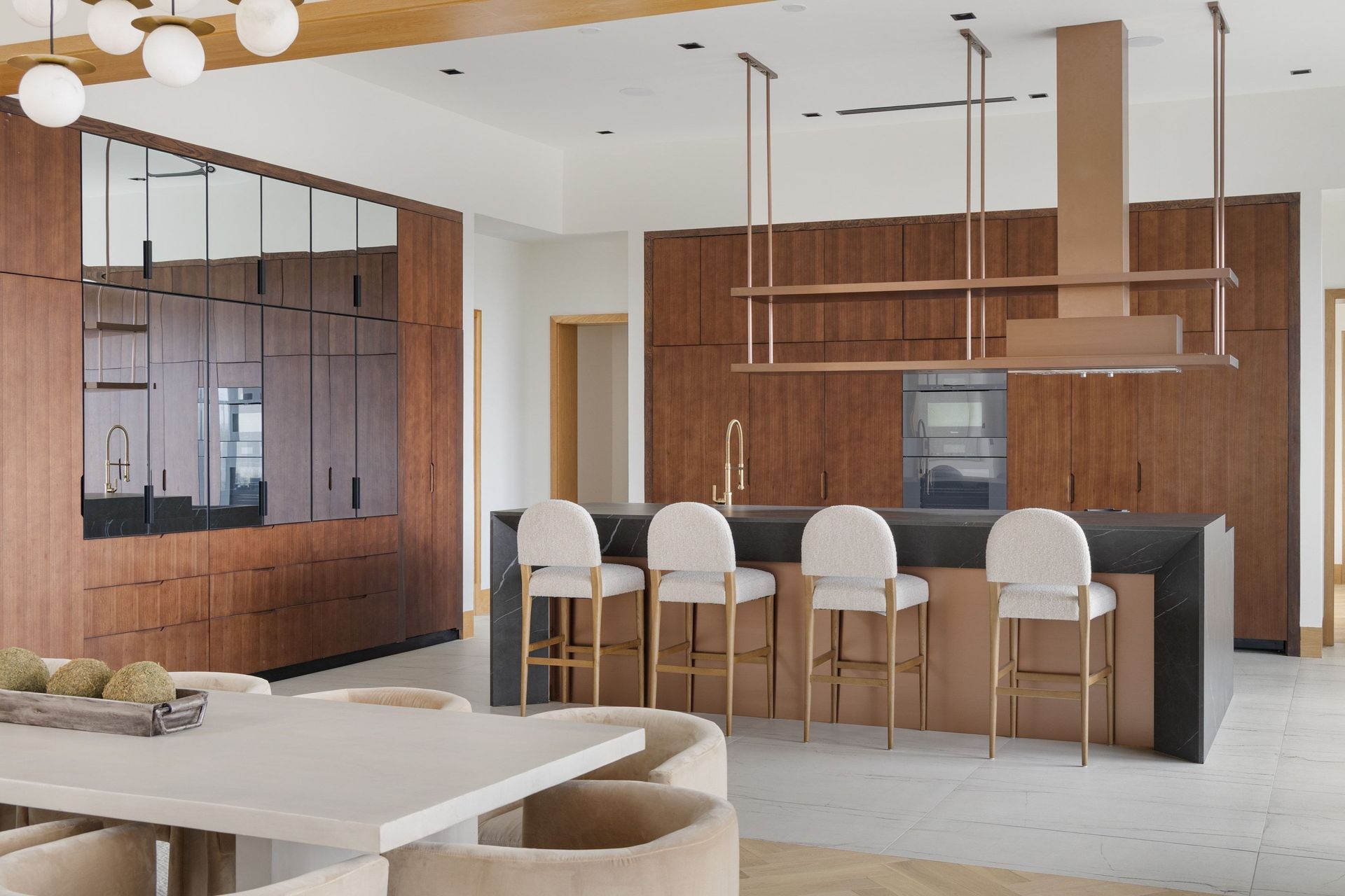 The kitchen and dining areas anchor the home’s central interiors. Custom cabinetry, generous stone surfaces, and professional-grade appliances define the chef’s kitchen, complemented by a fully outfitted butler’s kitchen for discreet hosting. A striking wine tower grounds the dining room, while a built-in bar creates a focal point for entertaining.