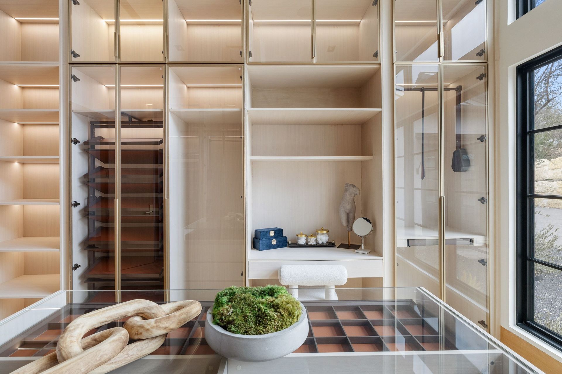 The primary retreat is situated as a sanctuary, set apart from guest accommodations and secondary wings. The bedroom features a fireplace and uninterrupted views. In the spa-inspired bath, refined finishes, a soaking tub, and a glass-enclosed shower are complemented by separate boutique-style dressing rooms.