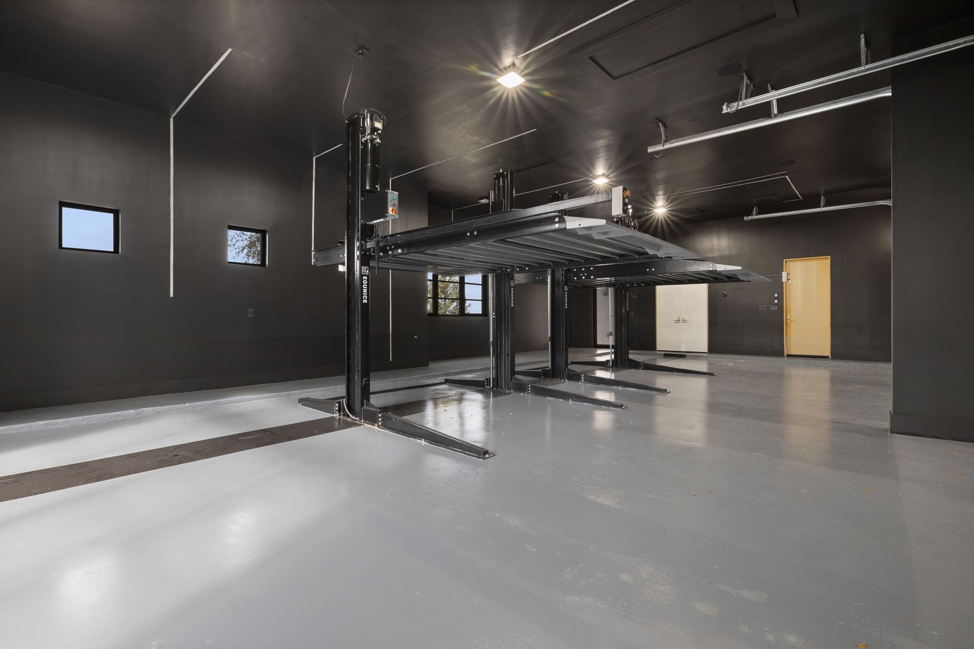 A climate-controlled garage with a professional-grade lift system provides secure storage for an automotive collection.
